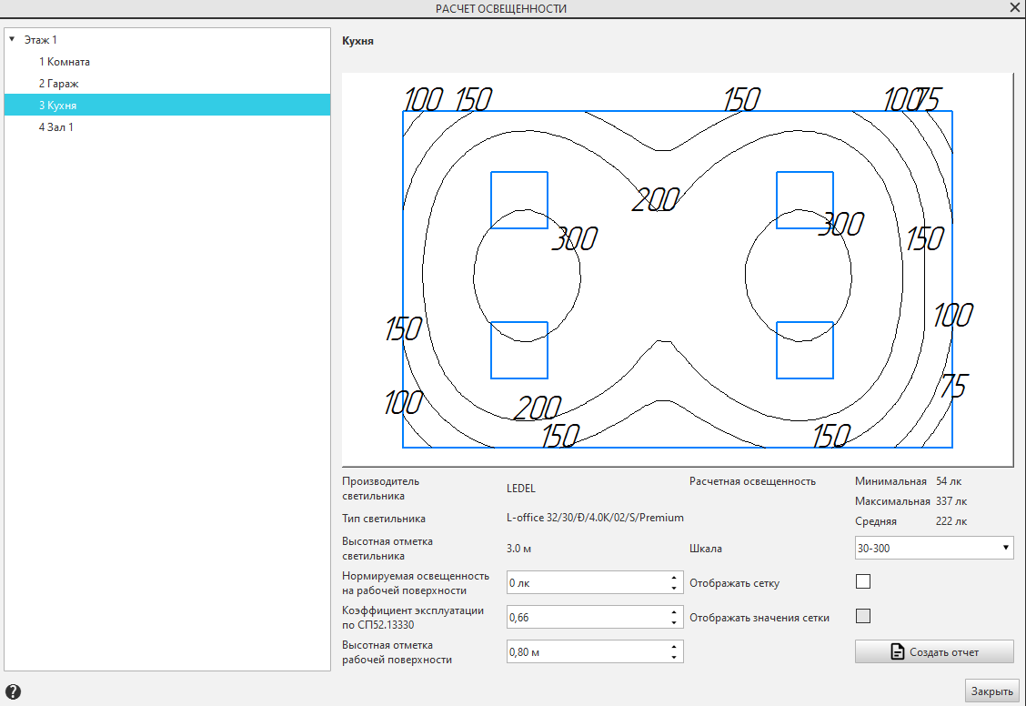 - автоматически выполнять светотехнические и электротехнические расчёты;