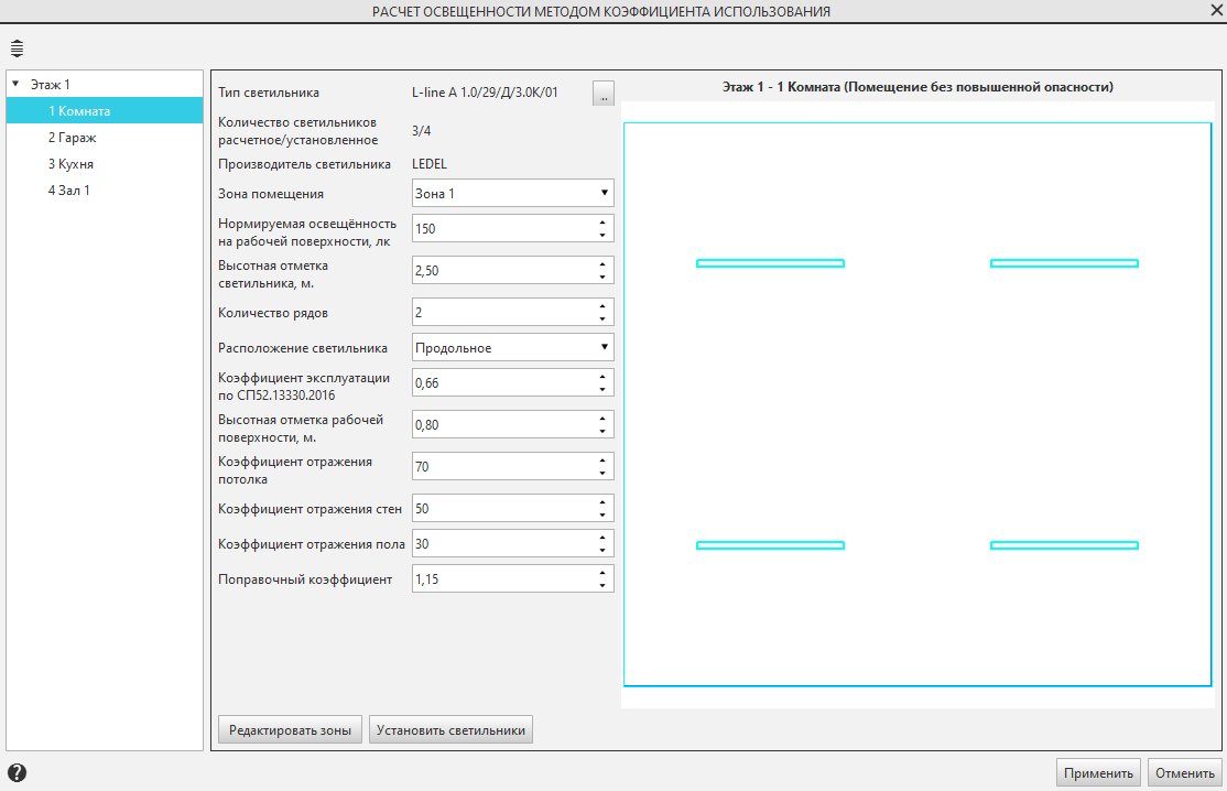 Рис. 45 – Расчет освещенности методом коэффициента использования (Ки)