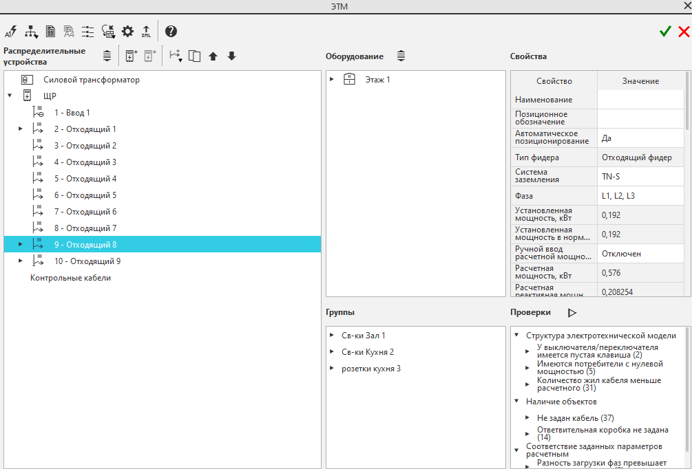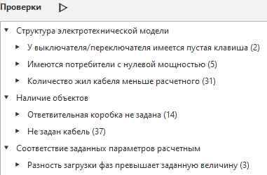 В режиме реального времени система автоматически производит проверку структуры ЭТМ на наличие объектов и соответствие заданных и номинальных параметров расчетным. Осуществляется более 35 проверок. Допустимые значения указываются в настройках ЭТМ.