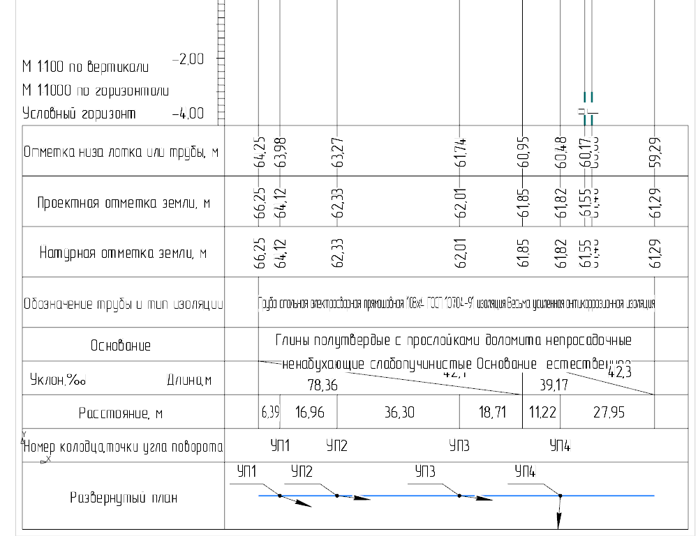 - Продольные профили сетей создаются с автоматической прорисовкой линии земли и указанием пересекаемых коммуникаций и дорог. Заполняются данные в соответствии с формами 2 и 3 по ГОСТ 21.705-2016.
