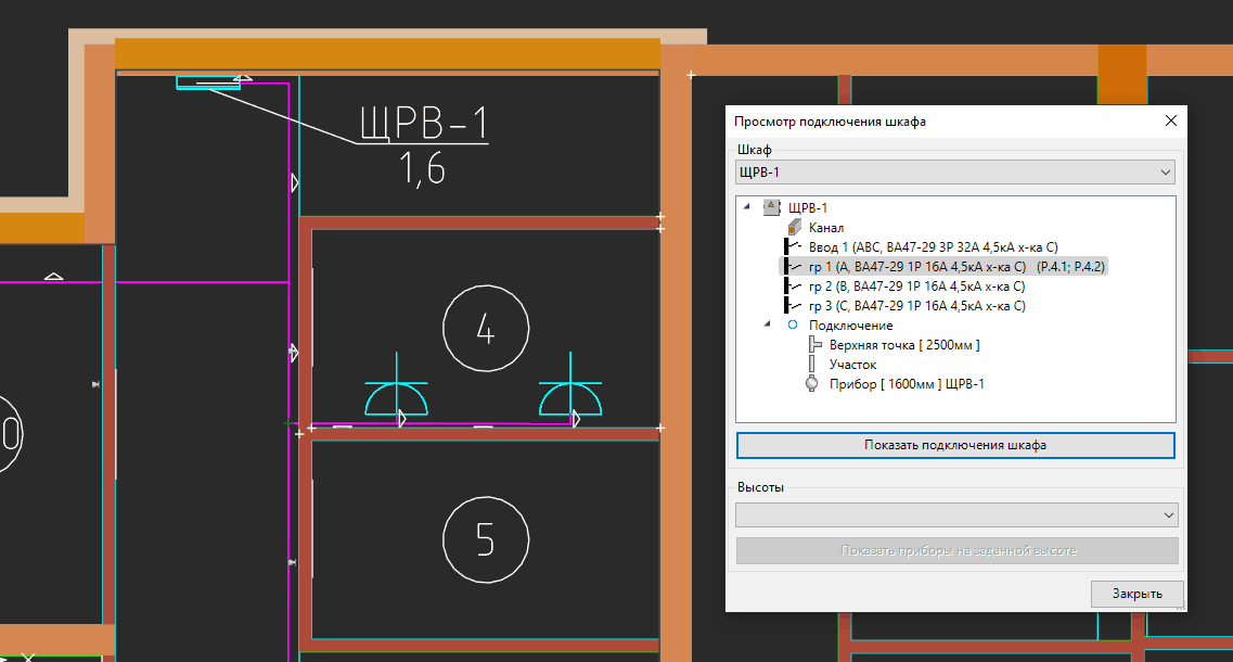 Добавили новую команду «просмотр объектов» - теперь есть возможность подсветить (показать) элементы на плане и проверить их точность подключения к выбранным группам электрического щита/шкафа.